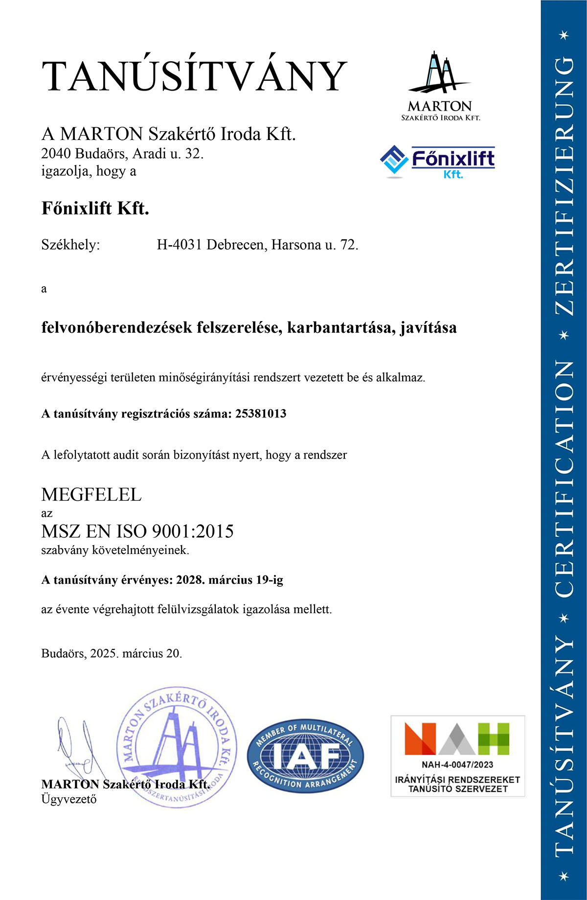 A Főnixlift Kft. a Lift-s egyesület és Magyar Felvonó Szövetség tagja